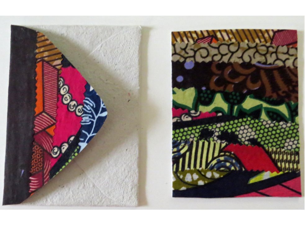 These cards are handmade in a refugee camp in Malawi in southern Africa.They are made from fabric off cuts and recycled newsprint. Each card has a matching envelope.The layout of the fabric on each card variesFair Trade