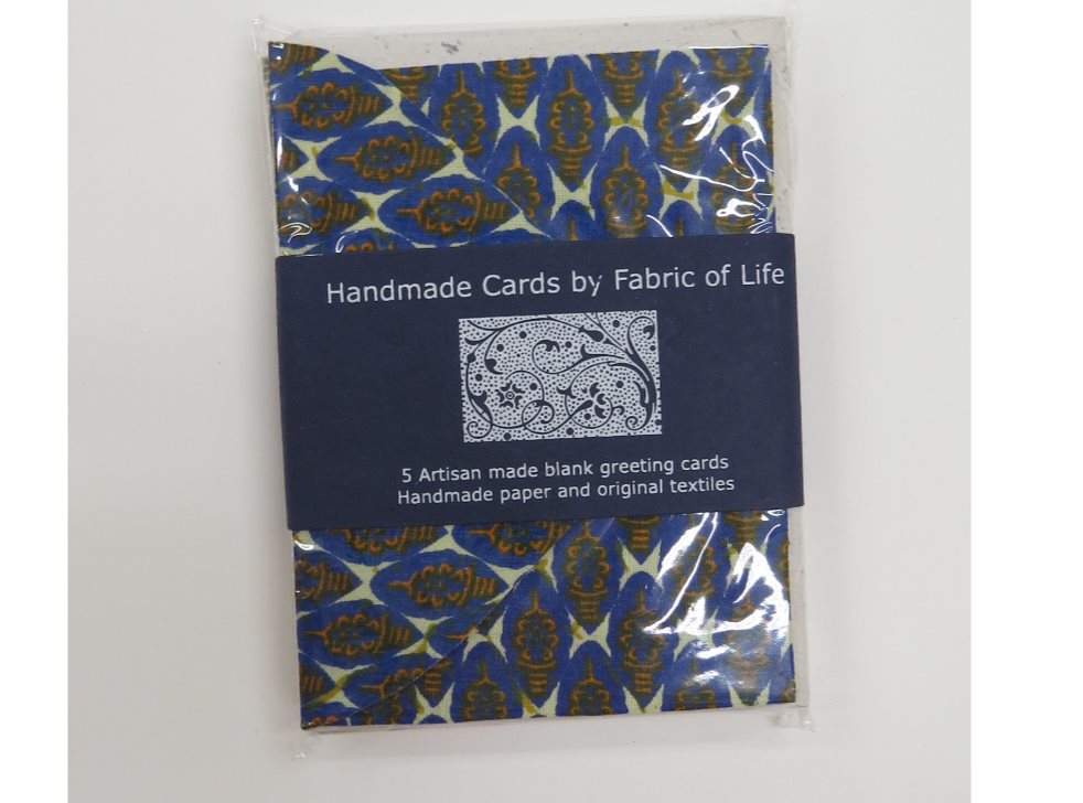 Pack of 5 mixed cards in shades of blueThese cards are handmade in a refugee camp in Malawi in southern Africa. They are made from fabric off cuts and recycled newsprint. Each card has a matching envelope.The layout of the fabric on each card variesFair Trade