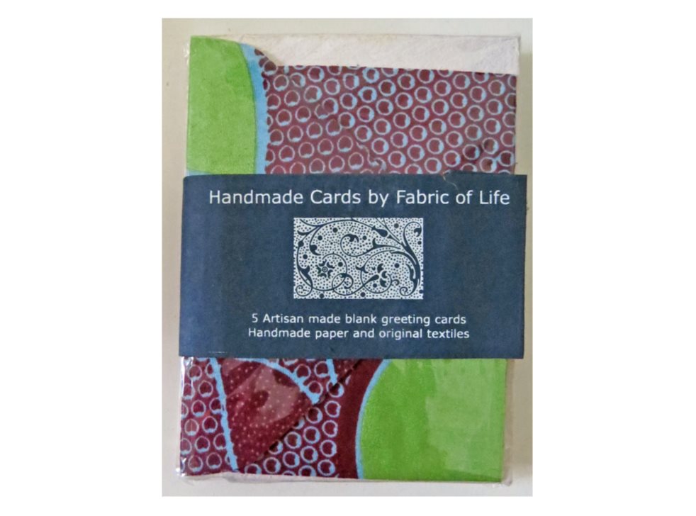 Pack of 5 mixed greeting cards.These cards are handmade in a refugee camp in Malawi in southern Africa.They are made from fabric off cuts and recycled newsprint. Each card has a matching envelope.The layout of the fabric on each card variesFair Trade