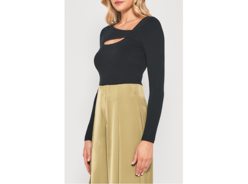 The Allie Top is a medium weight ribbed knit top, featuring an asymmetric and cut out neckline, long sleeves and is a fitted design