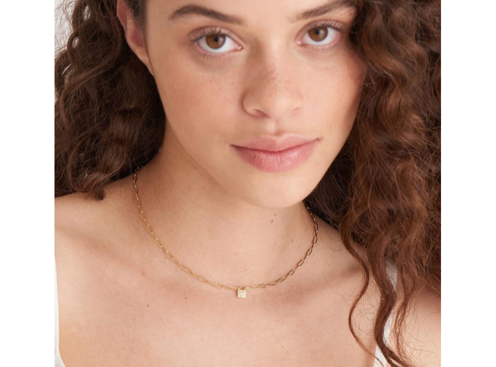 Get your 2021 style locked down with this chunky chain necklace complete with padlock pendant detailing. Compact but with impact, this on-trend link chain pairs up perfectly with more delicate chains to create your own layered necklace look. Discover a single sparkling stone of cubic zirconia in the centre of the padlock for just enough glamour. - • Material: 14kt gold plated on sterling silver - • Necklace length: 400mm with 50mm extender - • Pendant size: 6mm x 9mm - • Weight: 4.7g