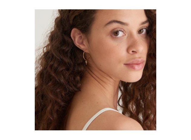 This collection’s take on the perfect pair of simple hoop earrings is catching all the attention. Our smooth and sleek mid-size hoop earring just wouldn’t be complete without this stunning micro key pendant detail to finish the look. With an angular cubic zirconia stone included, this unique pair of hoops promises to catch the light with every move. - • Material: 14kt gold plated on sterling silver - • Hoop size: 25mm - • Charm size: 4mm x 7mm - • Weight: 1.5g