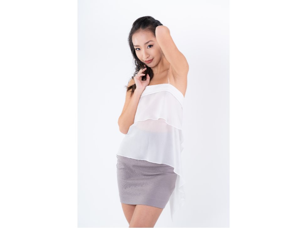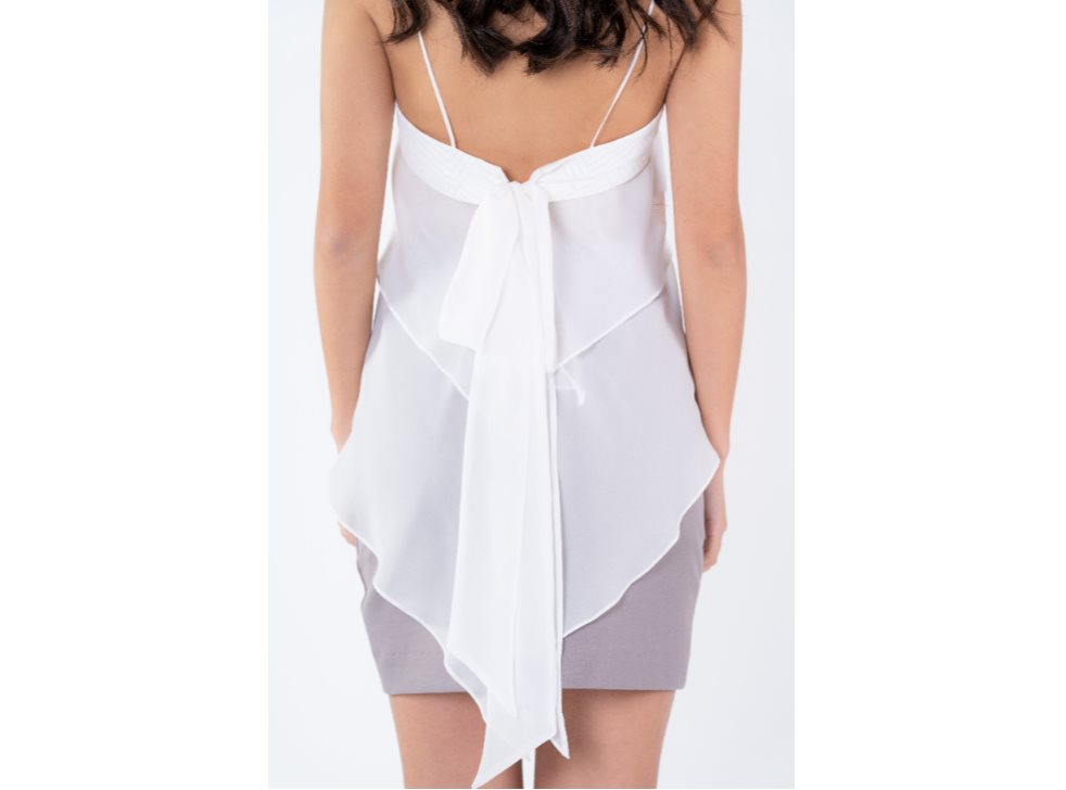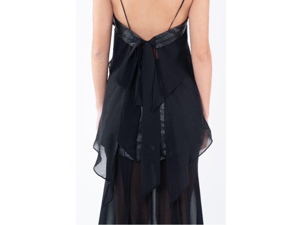 Double textured top with Spaghetti straps and a double layer of Silk Georgette, with hem faking lower at the back. Complete with generous Silk tie closure at the back.
