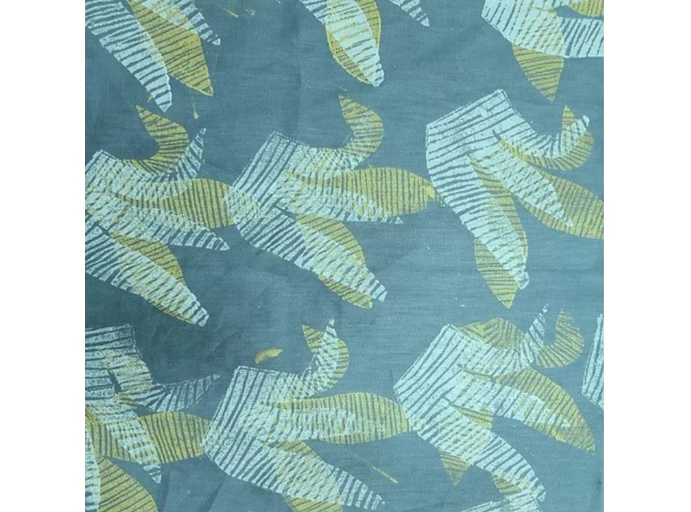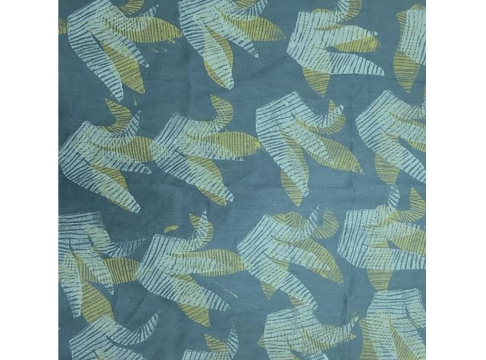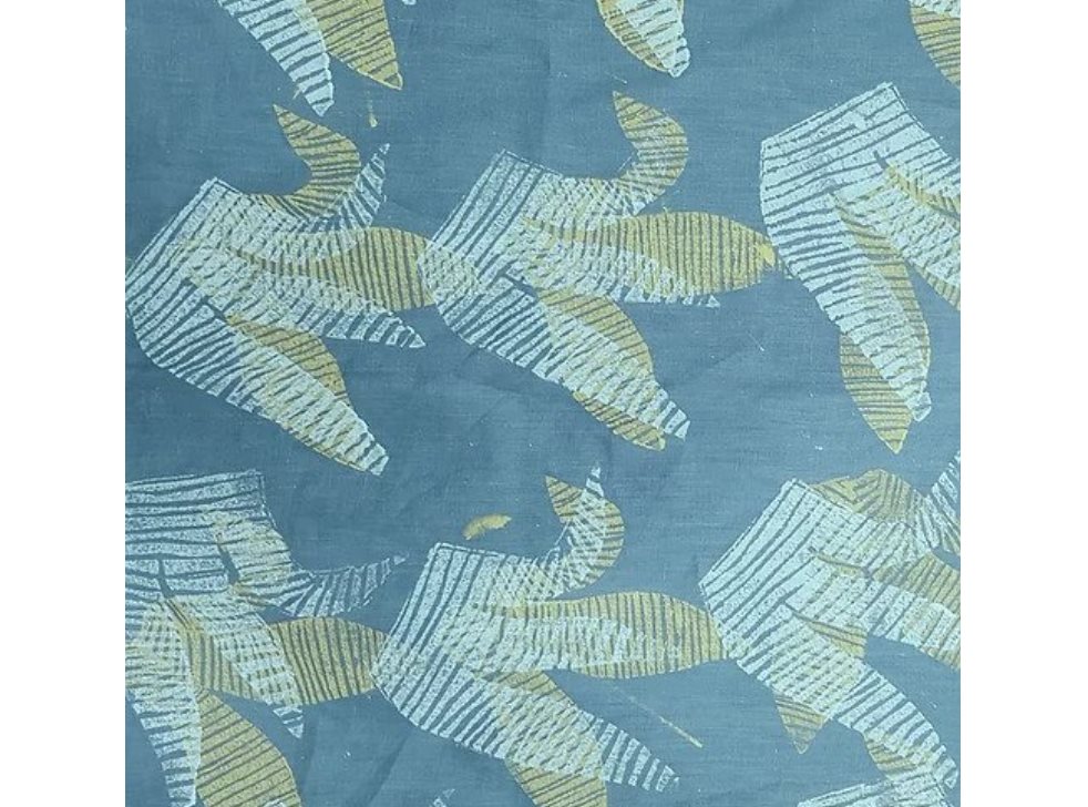 This lampshade is handmade from hand printed Australian Aboriginal fabric, Gerdewoon Thoon Malin (Boab nut and water weed) from Waringarri Art Centre in Kununnura. Designed by Dora Griifths Gerrgngarri. Language: Miriwoong/Ngarinyman. Country: Keep River, Timber Creek. Hand blocked print on Linen. Blue Green colour. Waringarri is the first wholly indigenous owned art centre established in Western Australia and one of the oldest continuously operating art centres in Australia supporting economic independence for artists and their community. The centre operates artists, studios and galleries and supports more than 100 artists as painters, printmakers, wood carvers, boab engravers, sculptors and textile artists.