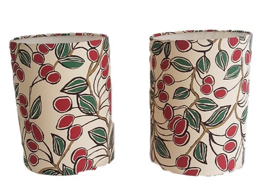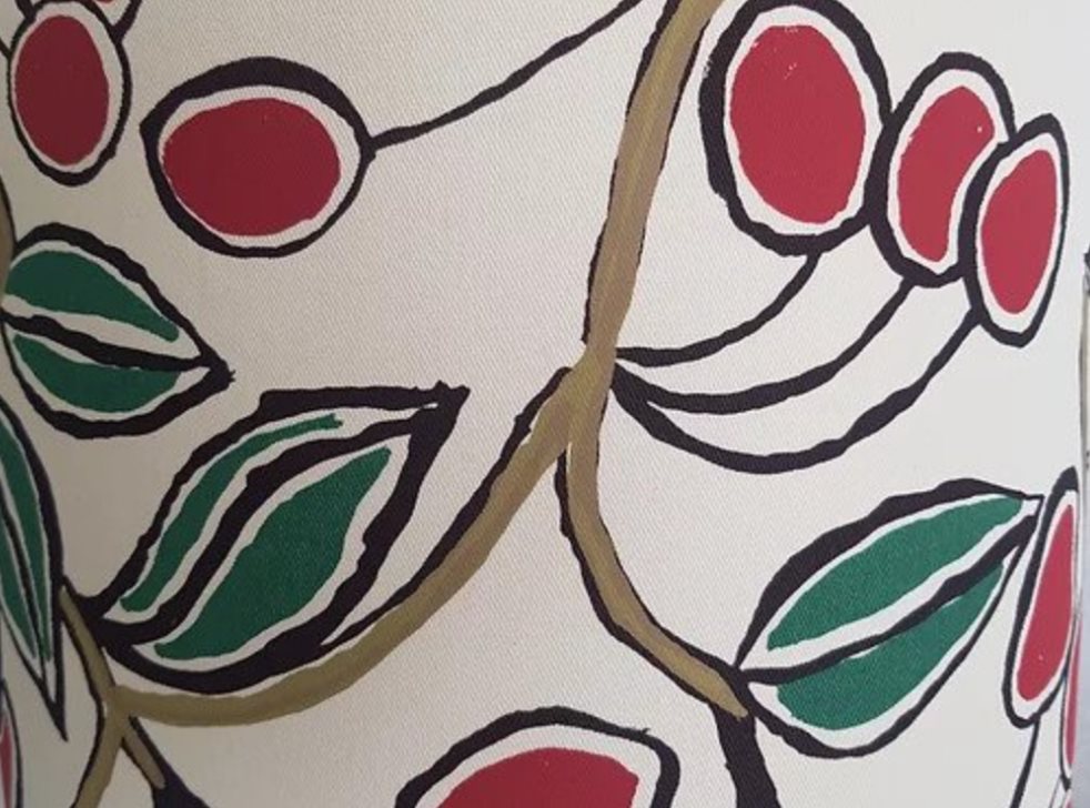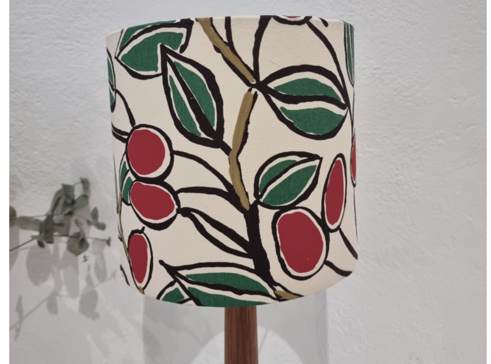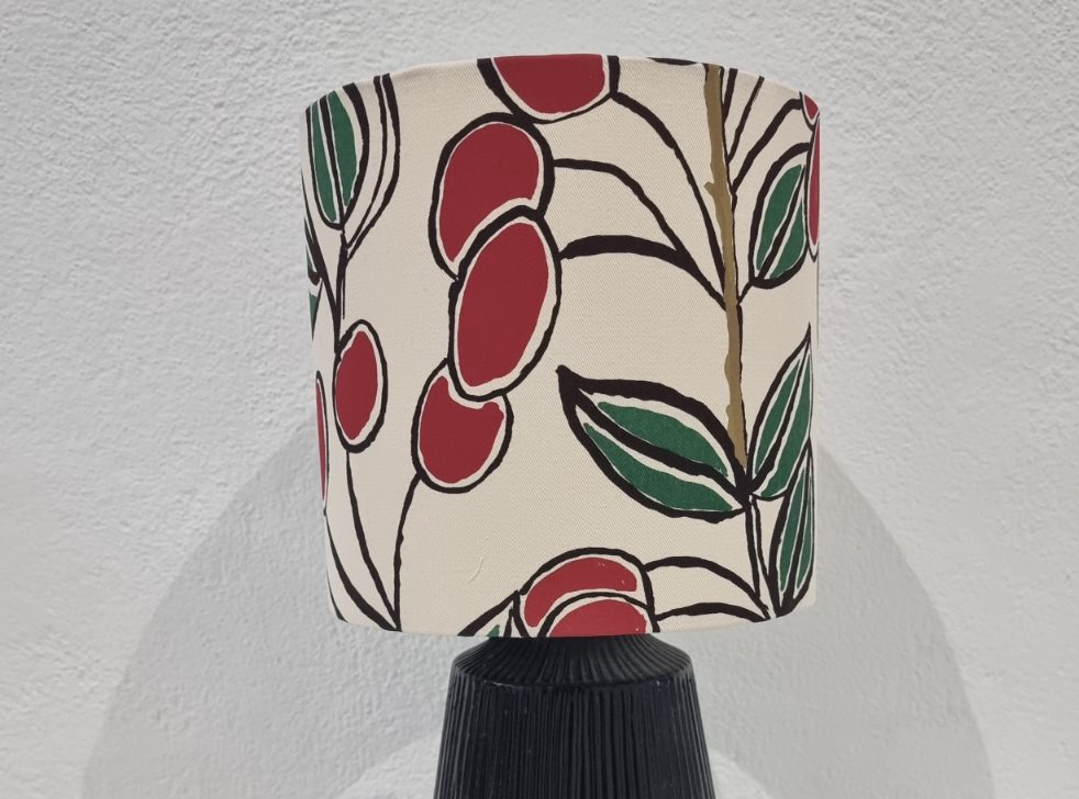 This lampshade is handmade from hand-printed Australian Aboriginal fabric, Yaminyarri (Gubinge) from Nagula Jarndu in Broome, Western Australia. It was designed in 2016. Designer: Amanda Lee Rose is a Yawuru woman living in Broome. Amanda loves fishing, hunting and gathering and being on country as this is part of her Yawuru heritage. Design: Amanda's artwork stems from her inspiration from the land and sea and old people's stories. Yamiyarri (Gubinge) is a medicinal plant that grows in the Kimberley region and is very potent in vitamin C. The base fabric is birch and is a four-colour print with red, green, black and beige coloured details.