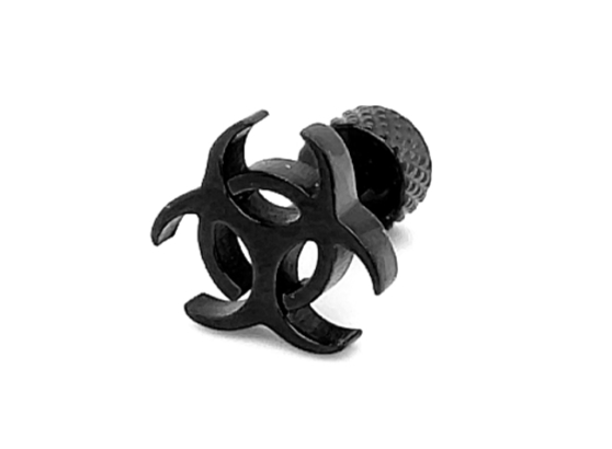 - 9 mm diameter biohazard sign- Single screw back earring- Sold as single earring- IP black plated 316L surgical stainless steel