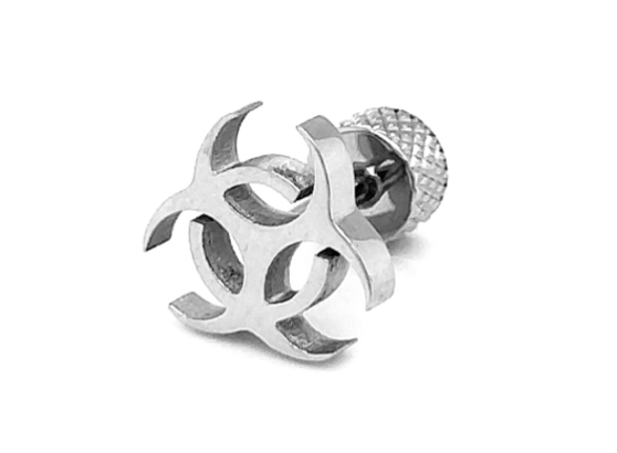 - 9 mm diameter biohazard sign- Single screw back earring- Sold as single earring- High polished 316L surgical stainless steel