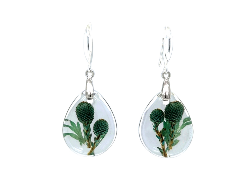 Each and every piece of the BOTANIGEM Jewellery collection is handmade, and are therefore similar yet uniquely different.Handmade 3D drop shaped pendant with dried flora.Dried Button Bush in the resinEarring size : 20 mm (W) X 48 mm (H)925 sterling silver hook