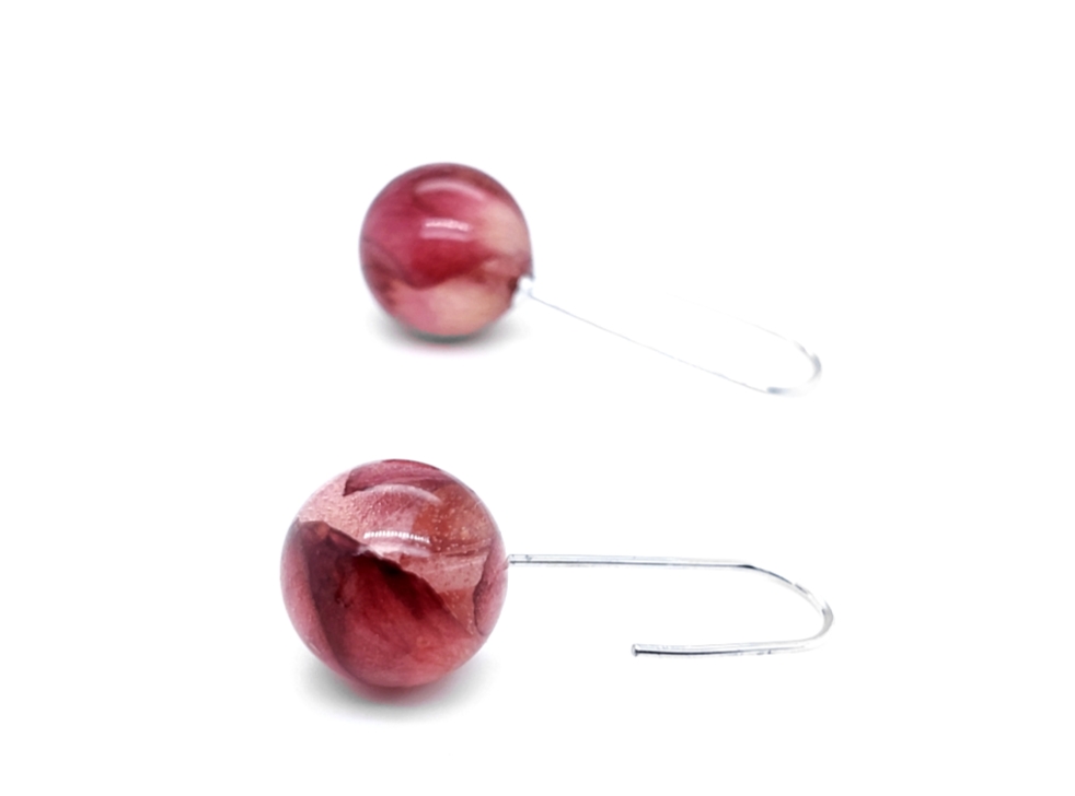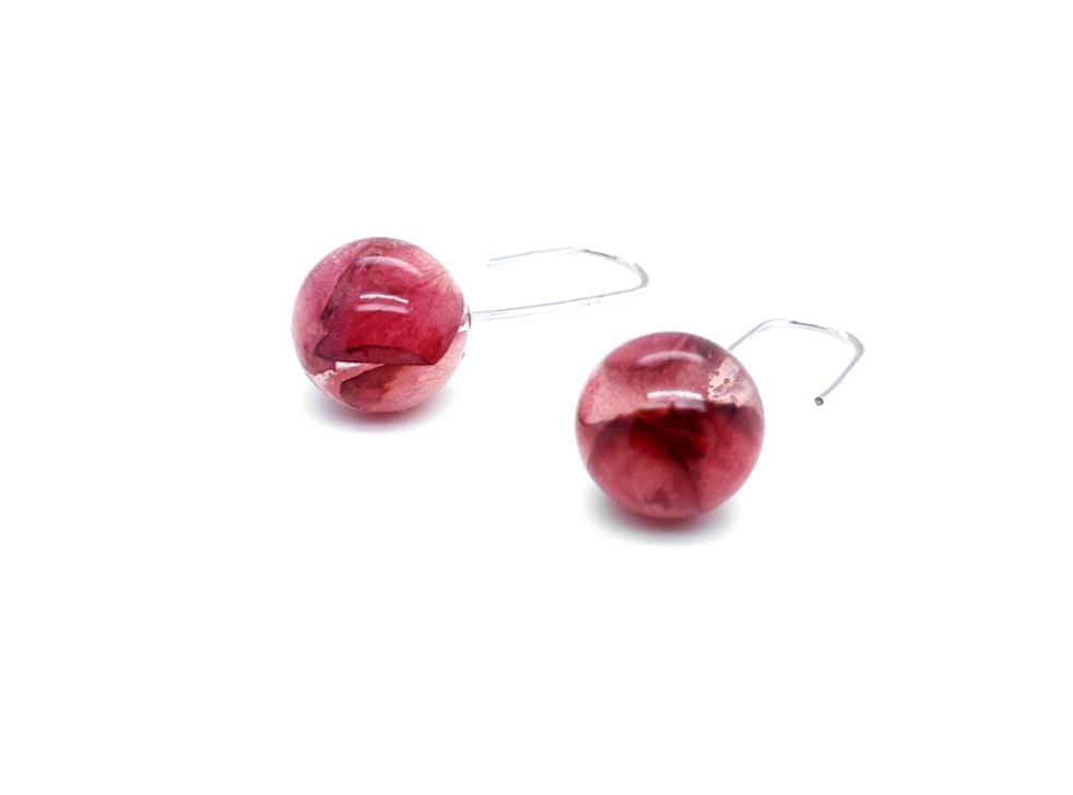 - Miniature Rose petals in the resin.- 12 mm diameter ball shaped earrings set in Rhodium plated 925 silver cane hook.- Total length 35 mm.- Handmade in South Australia