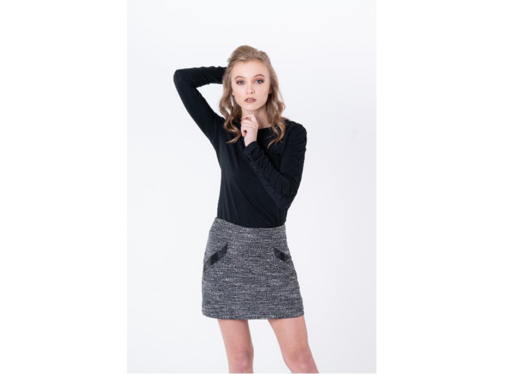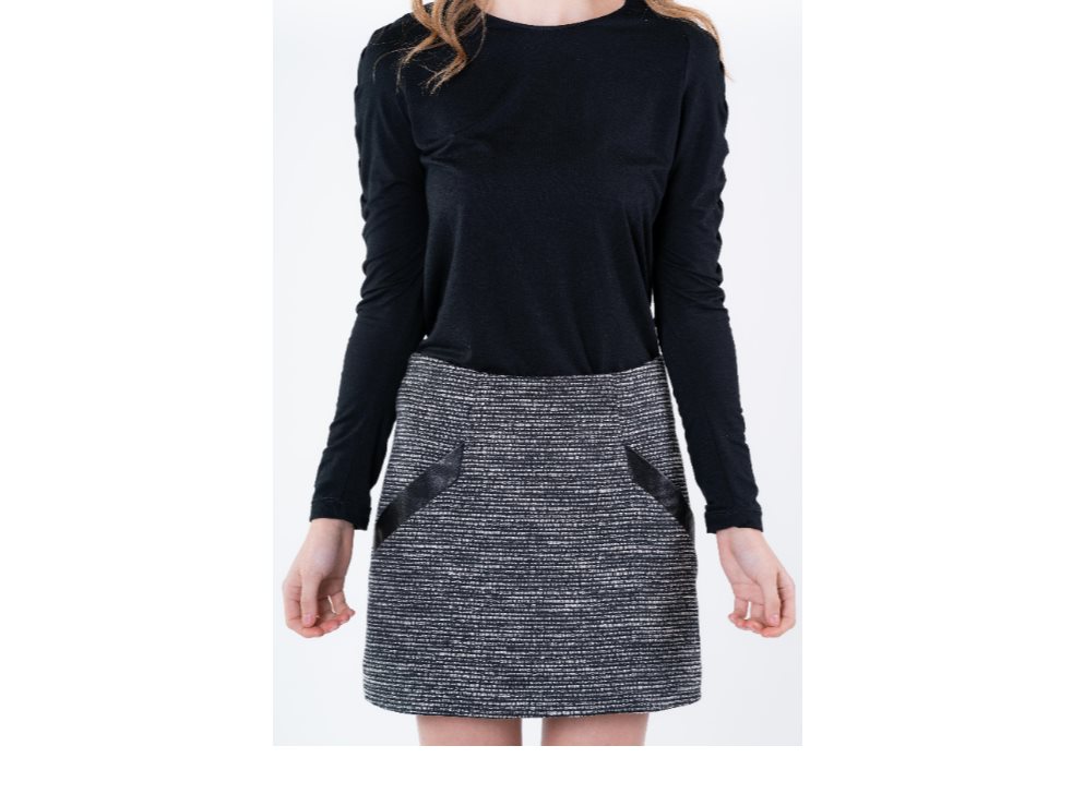 A stunning skirt made from black and Ivory Tweed with a touch of silver metallic fabric. You choose from leather or vegan leather trimmed pockets.Darts to back skirt.Fully lined