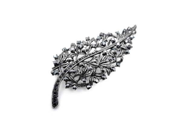 - Casting gun metal colour leaf brooch.- Black Swarovski crystal.- 50 mm (W) X 80 mm (H)- Made in South Korea.