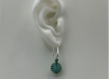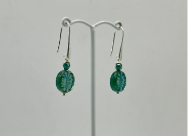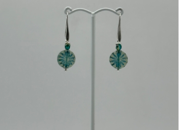 Very cute Czech glass coin beads. They have a pretty starburst pattern on both sides and a facet highlight top bead. 45mm long and very wearable!