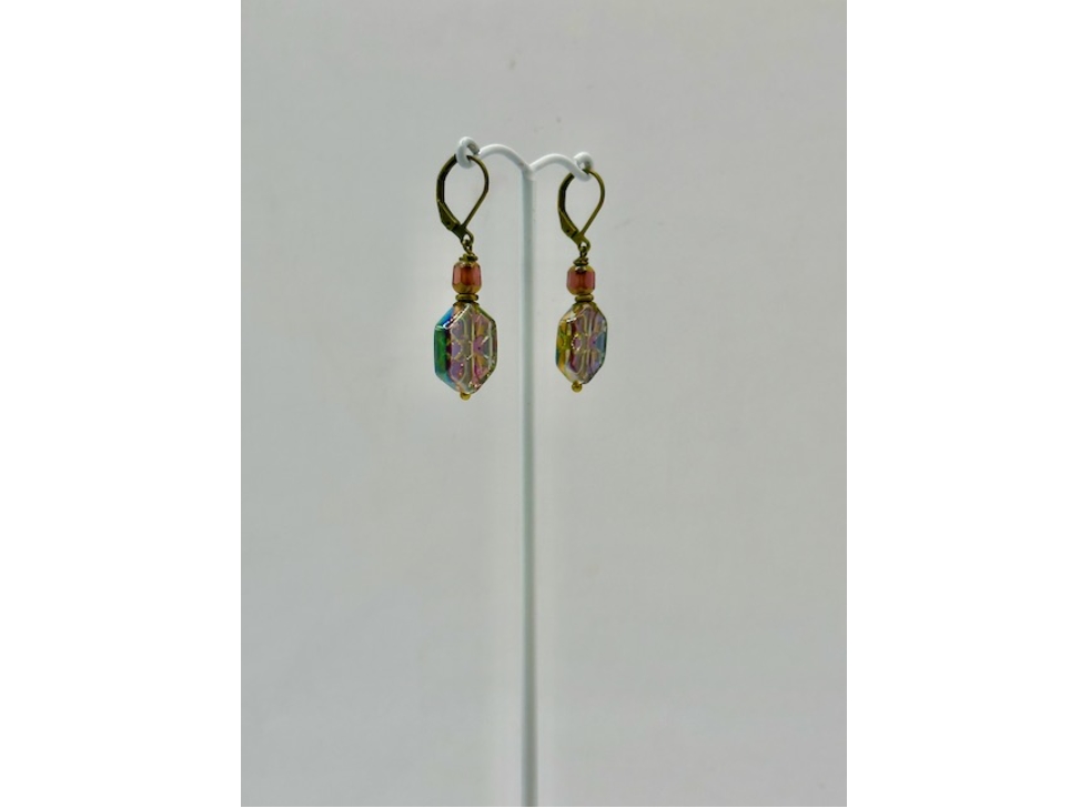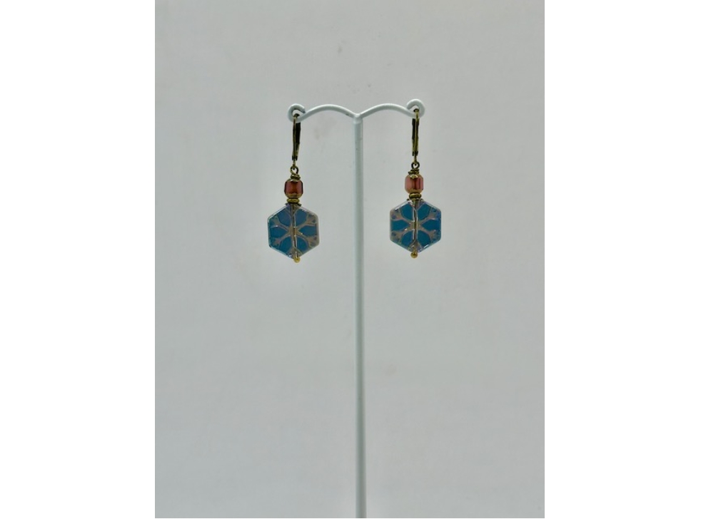 So pretty! This purple snowflake design is Czech Lustre glass and is a bit hard to photograph. They really have a marvellous shine and a very nice detailed pattern on each side. They measure 40mm from the top of the secure lever back ear hook and are 15mm wide.
