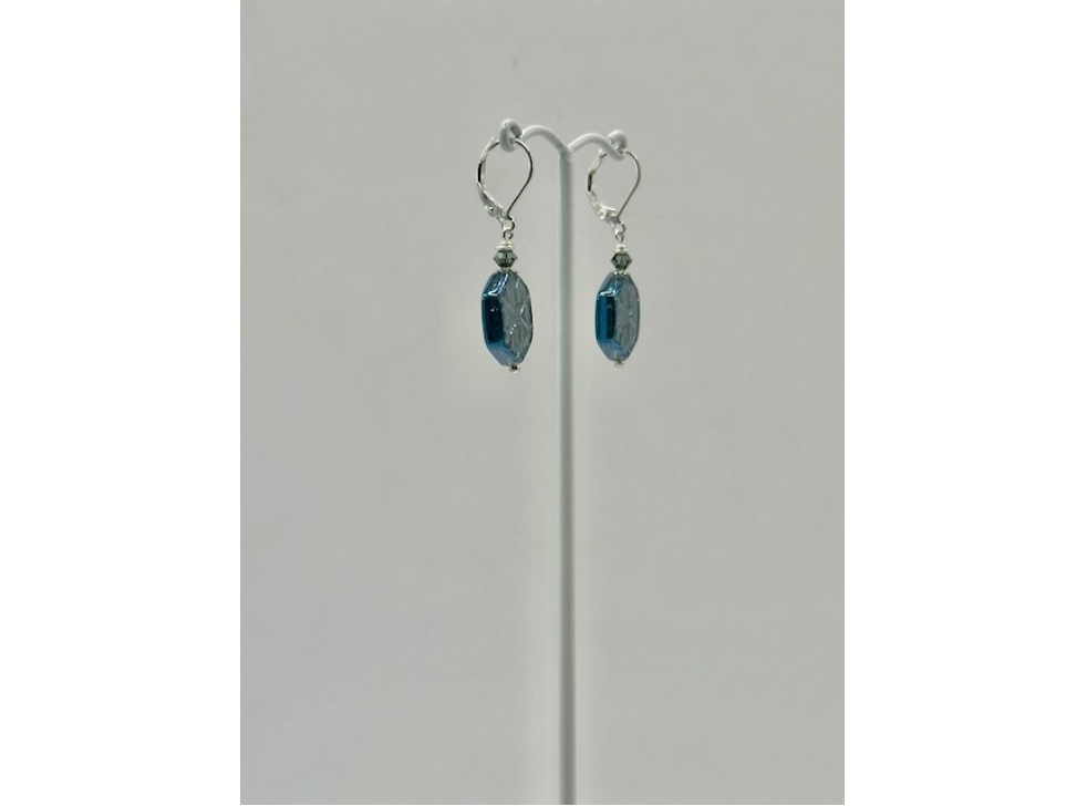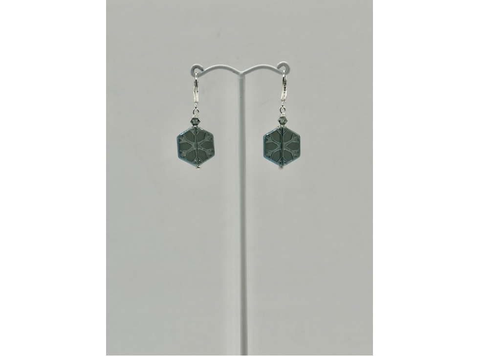 So pretty! This Blue snowflake design is Czech Lustre glass and is a bit hard to photograph. They really have a marvellous shine and a very nice detailed pattern on each side. They measure 40mm from the top of the secure nickel free lever back ear hook and are 15mm wide.