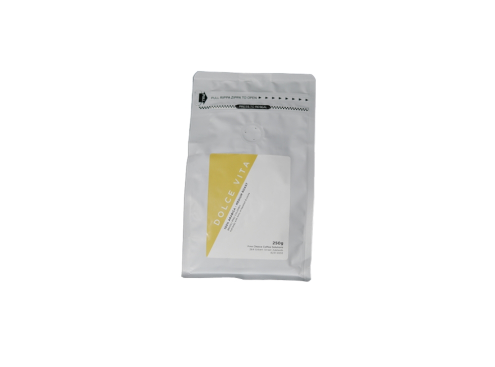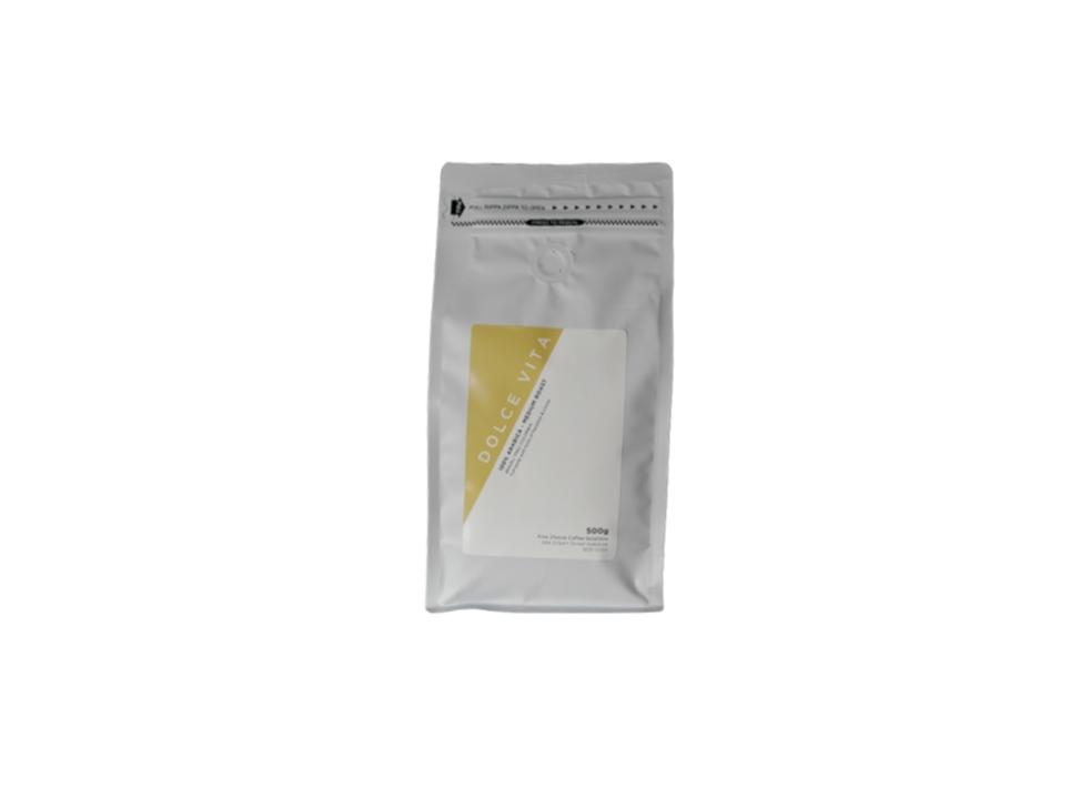 DOLCE VITA - Medium Roast100% Arabica Coffee Beans - Brazil / PNG / ColumbiaFull bodied with hints of hazelnut and cocoaRoasted in Australia exclusively for Fine Choice Coffee Solutions Our most popular, all rounder, perfect for milk based coffee drinks