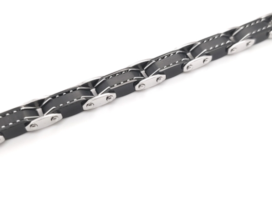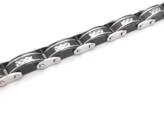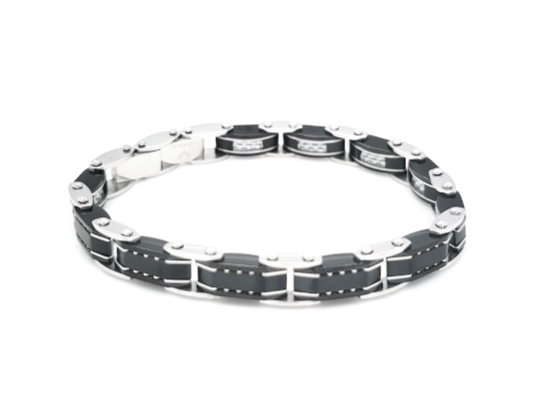 - 6 mm wide stainless steel and white carbon fibre chain bracelet.- Double side design for two different style.- 19 cm included 2 cm interchangeable clasp.- IP black plated matte and high polished finish