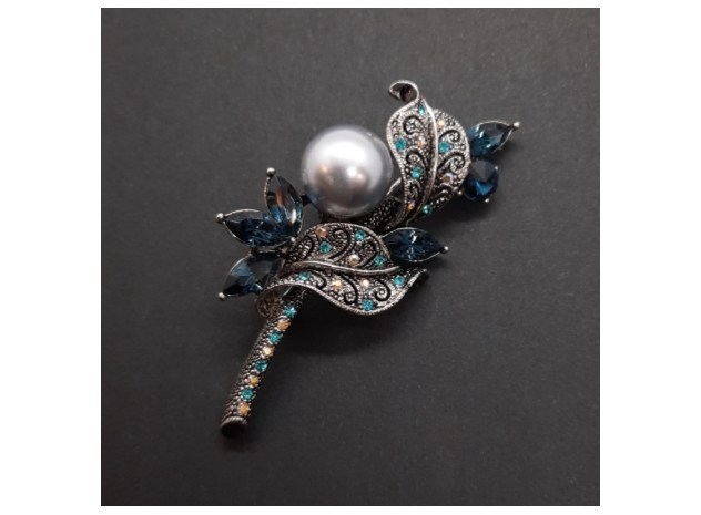- Casting gun metal colour crystal brooch.- Sapphire blue and topaz colour Swarovski crystal with faux pearl.- 33 mm X 70 mm- Made in South Korea