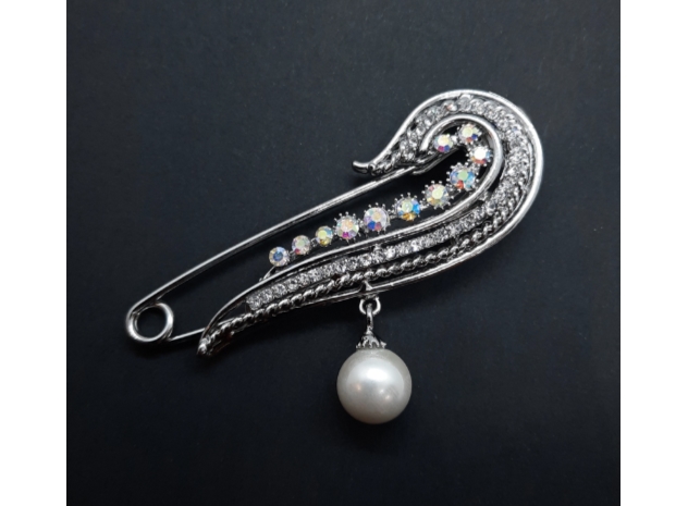 - Casting rhodium plated brooch.- AB colour Austria crystal with 12 mm diameter faux pearl pendant.- 45 mm X 80 mm- Made in South Korea.