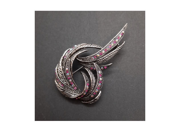 - Casting gun metal colour crystal feather brooch.- Purple Swarovski crystal embedded.- 35 mm X 65 mm- Made in South Korea.