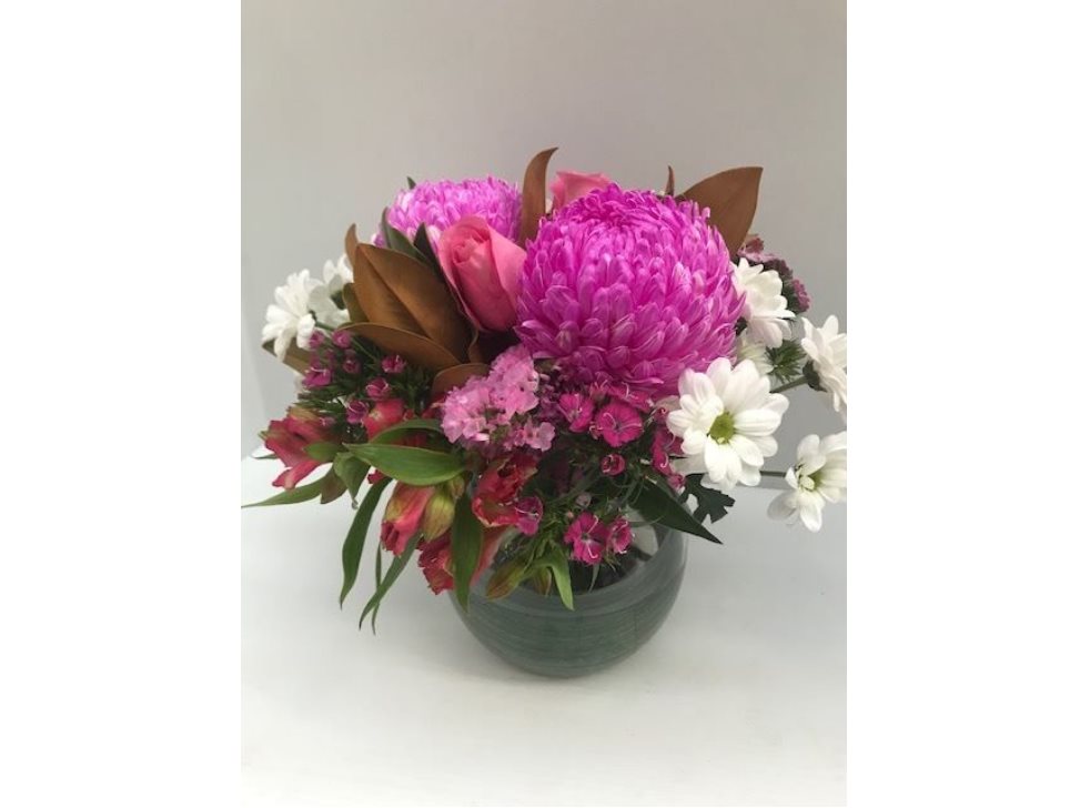Fresh seasonal blooms and foliage in a tight hand tied posy presented in a round fishbowl vase. White/greenPinksYellowsBrights