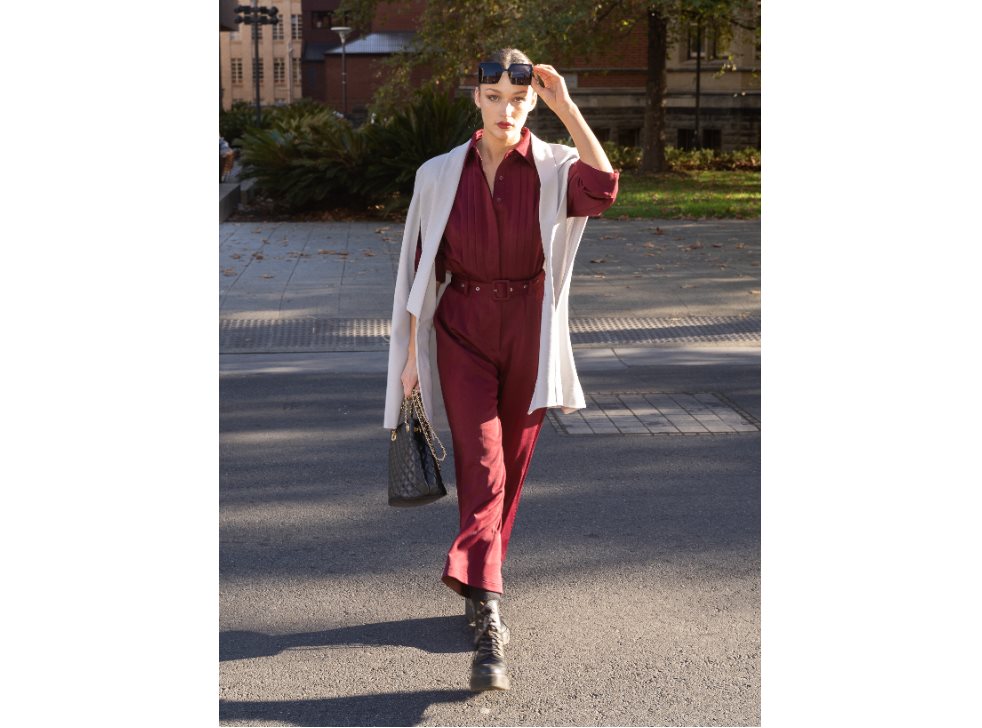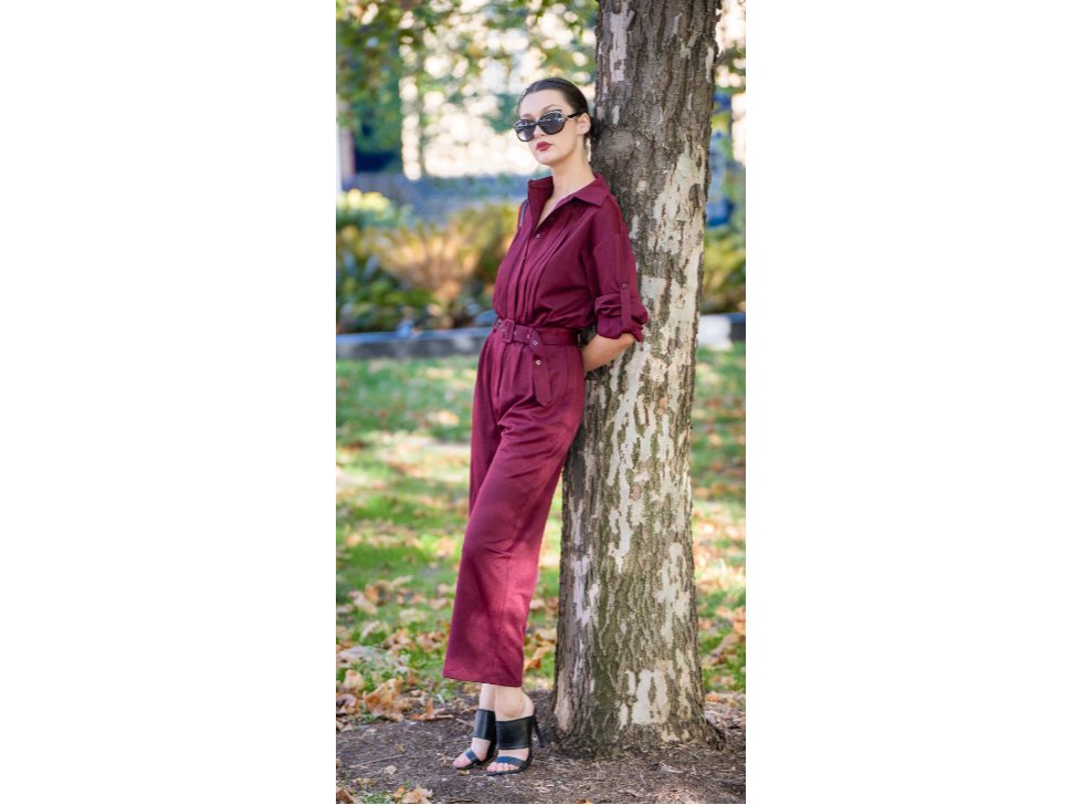 THE FONTANA JUMPSUIT IS THE BIG SISTER OF THE MUCH LOVED ELOISE JUMPSUIT. IT IS A LONG SLEEVE SHIRT STYLE JUMPSUIT WITH SIDE TABS TO FOLD UP THE SLEEVES AND FEATURES A CLASSIC SHIRT COLLAR WITH PLEATS AND BUTTONS THROUGH THE BODY. THE JUMPSUIT HAS A CLINCHED IN WAIST WITH A MATCHING BELT COMPLETED WITH A ZIP UP CIGARETTE STYLE FULL LENGTH PANT WITH SIDE POCKETS.