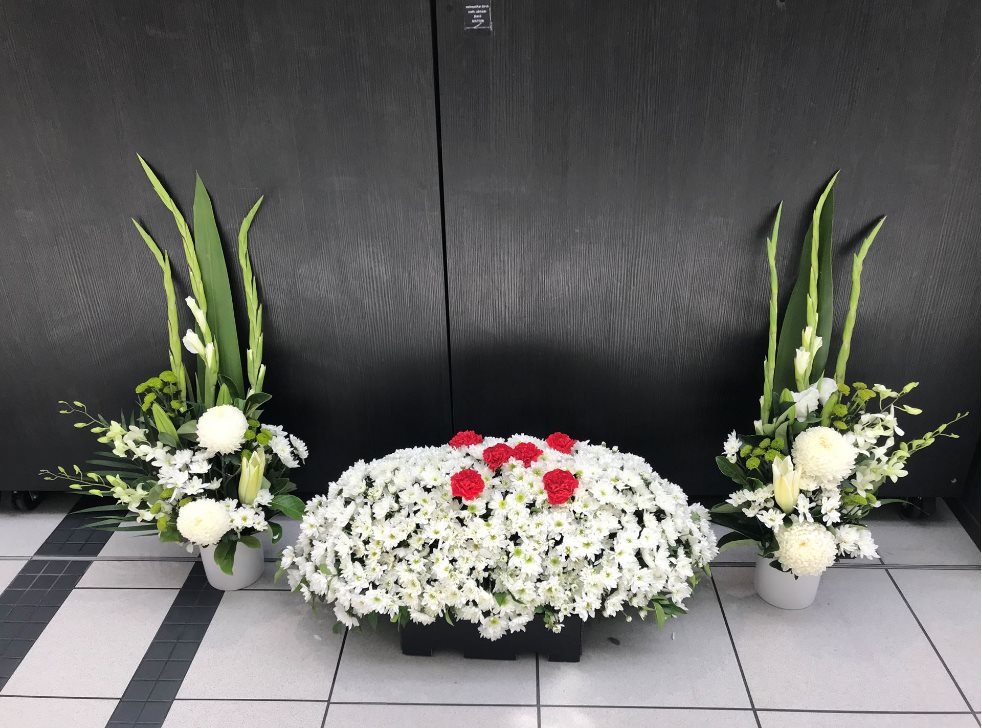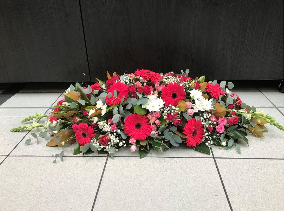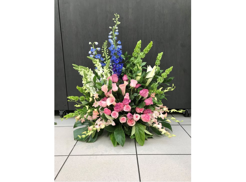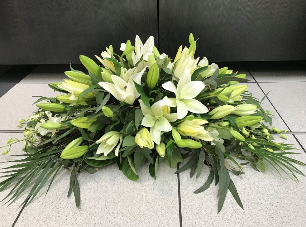 A tribute to the one you love. This funeral arrangement will gracefully express your thoughts. Crafted from seasonally available blooms and foliage. Minimum 2 days notice.Contact us directly for custom made options.