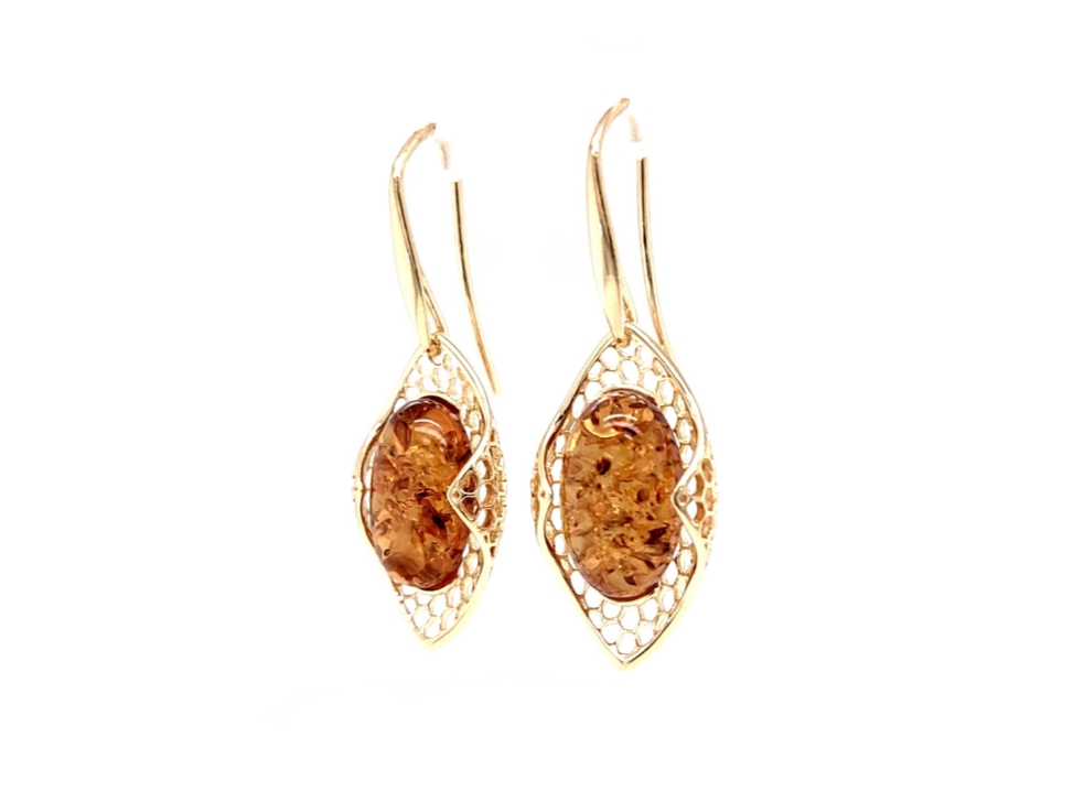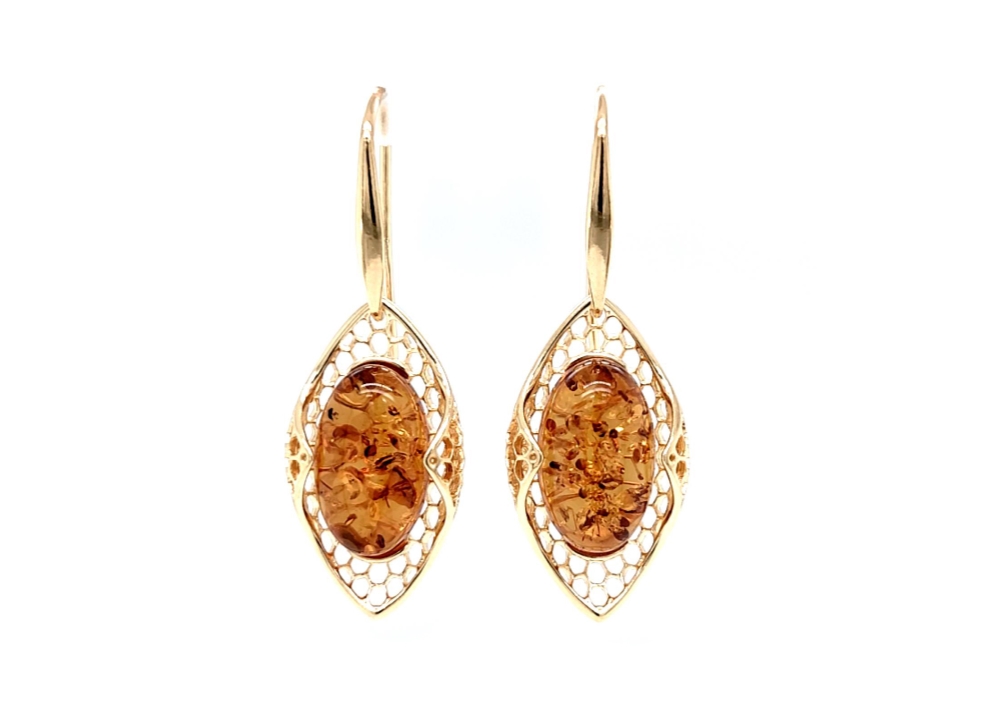 Amber is a fossilised tree resin – the original resin came from ancient pines which grew some 40~50 million years ago. Amber is attributed with many mystical and curative powers and is widely considered a talisman of good fortune.LIMITED EDITIONGenuine Baltic Sea Amber in 925 silver earringsYellow gold plated 925 sterling silver honey comb earringsSize : 15 mm (W) X 40 mm (H)Made in Poland