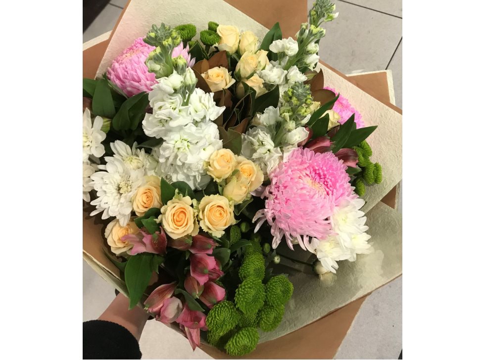 Carefully selected fresh seasonal blooms with foliage in a hand tied bouquet and lovingly gift wrapped in premium papers. White/greenPinksYellowsBrights Seasonal availability will apply to the choice of flowers available