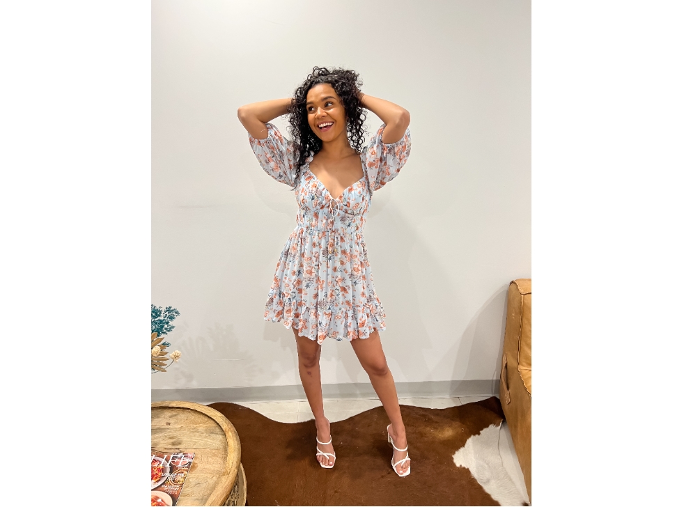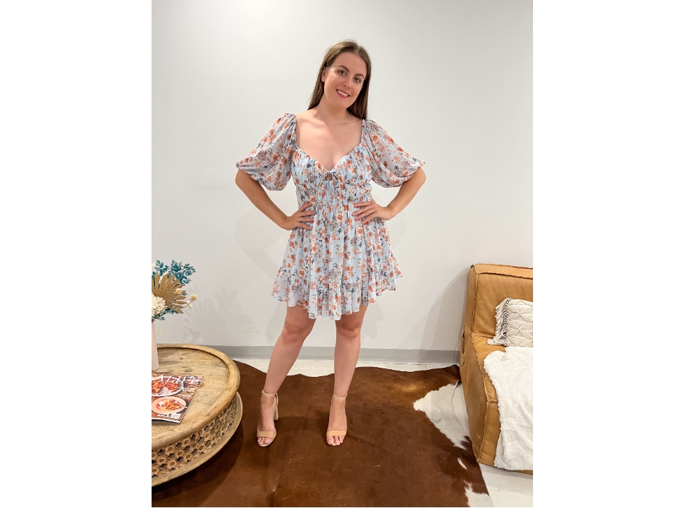 The Grace Dress is a pretty steel blue floral printed dress, featuring padded bust, elasticated shoulder and cuffs, string-tie detail in bust, ruffle hem and is mini length. Zipper in back and fully lined.