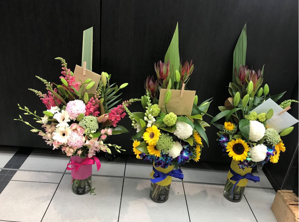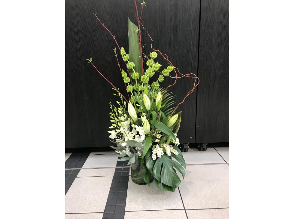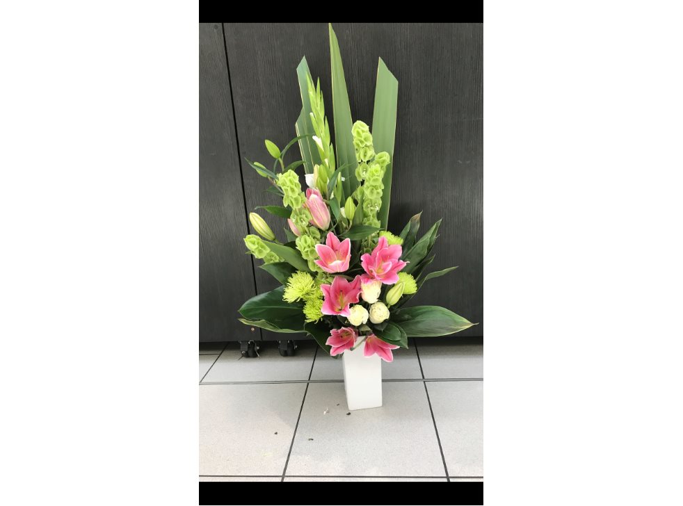 Stand out from the crowd with a tall grand display of mixed seasonal flowers and foliage, presented in a tall cylinder vase with a premium ribbon finish. Sure to turn heads. White/greenPinksYellowsBrights