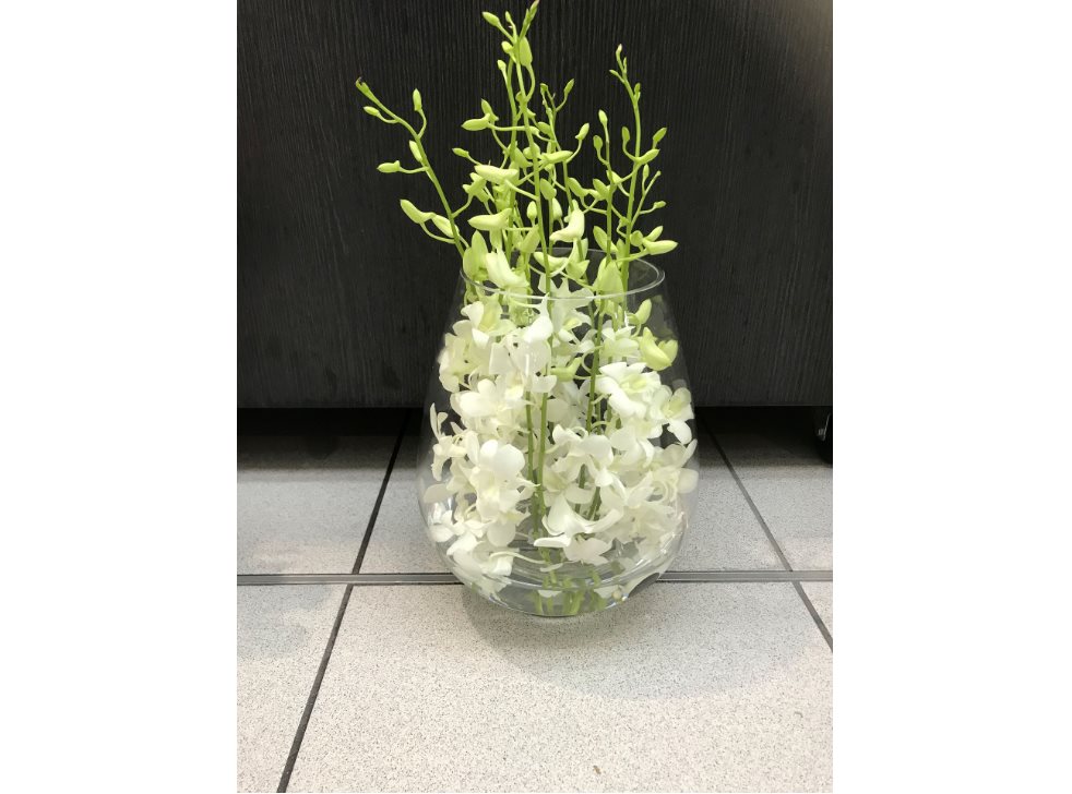 Tropical Singapore orchids displayed inside a beautiful round belly vase. A superior way to display each and every flower through the glass to see and enjoy perfectly. Colour availability may vary from photos