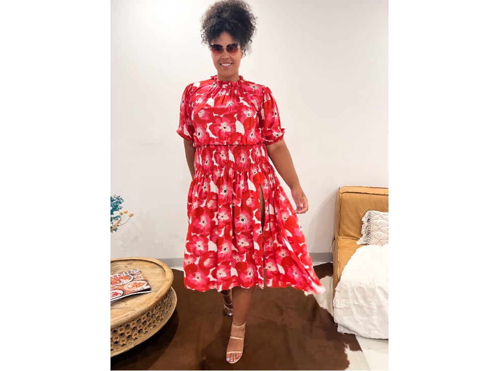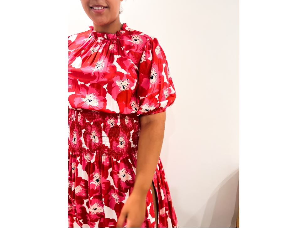 The Isabella Dress is a stunning hot pink and red midi dress, featuring a high neck, shirred waist, short puff sleeves and a front split