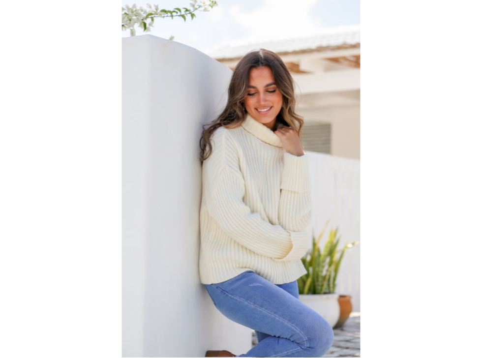 The Jacinta Knit is a beautiful soft wool blend ribbed knit, featuring a roll neck and cuff long sleeves also available in melon