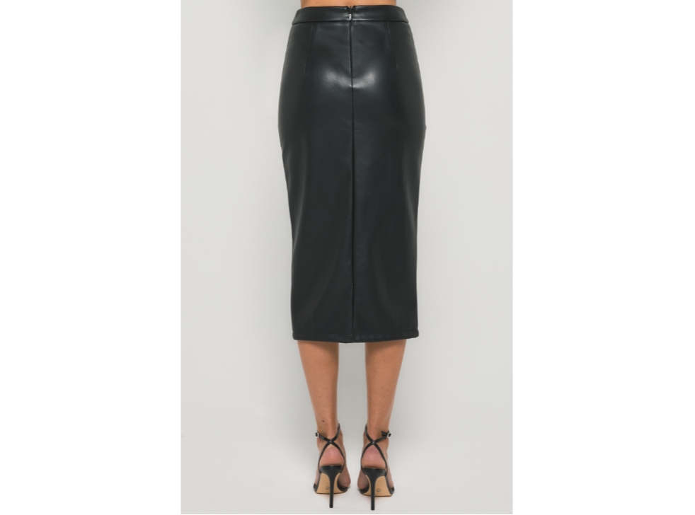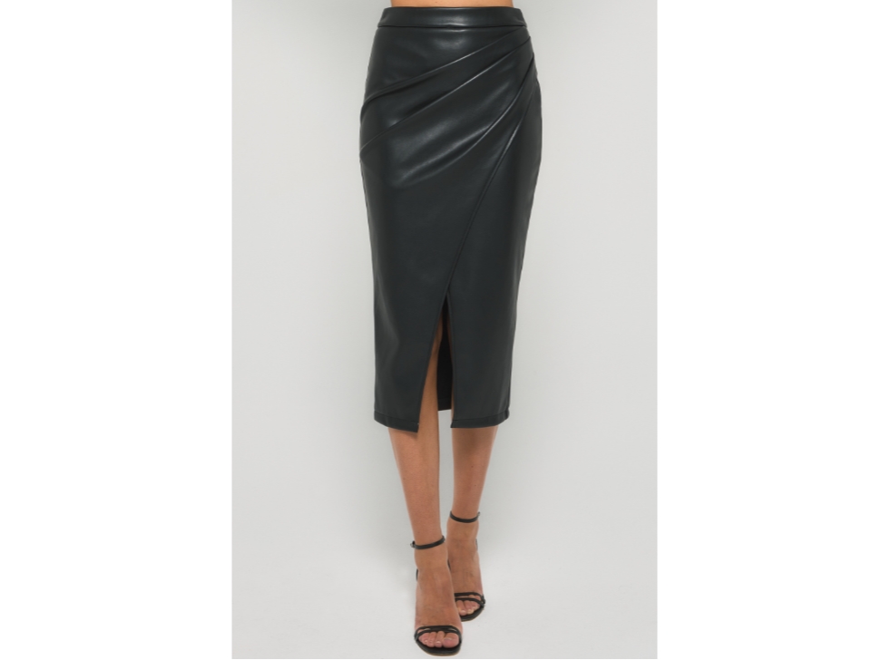The Jupiter Skirt is a faux leather midi length skirt, featuring side pleated detail, front split design and a centre back zip