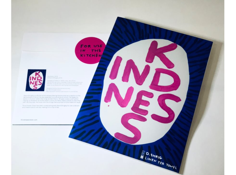Spread the "Kindness" tea-towelDavid Shrigley, Kindness, 2018. © David ShrigleyThis is a digitally printed artwork on 100% linen. It can be seen as a functional domestic art tea towel or an artwork to be displayed in your home. About the ArtistDavid Shrigley is a British artist who has come to prominence through his drawings, publications and sculptural works. His drawings have a kind of throwaway beauty peopled as they are with monster children, idiots, aliens, bad parents and full of twisted lists and exchanges. Specifications100% Linen tea-towel measures: 67cm x 50cm (26.4" x 19.7")Comes packaged in a full colour sleeve: 23x31x1.5