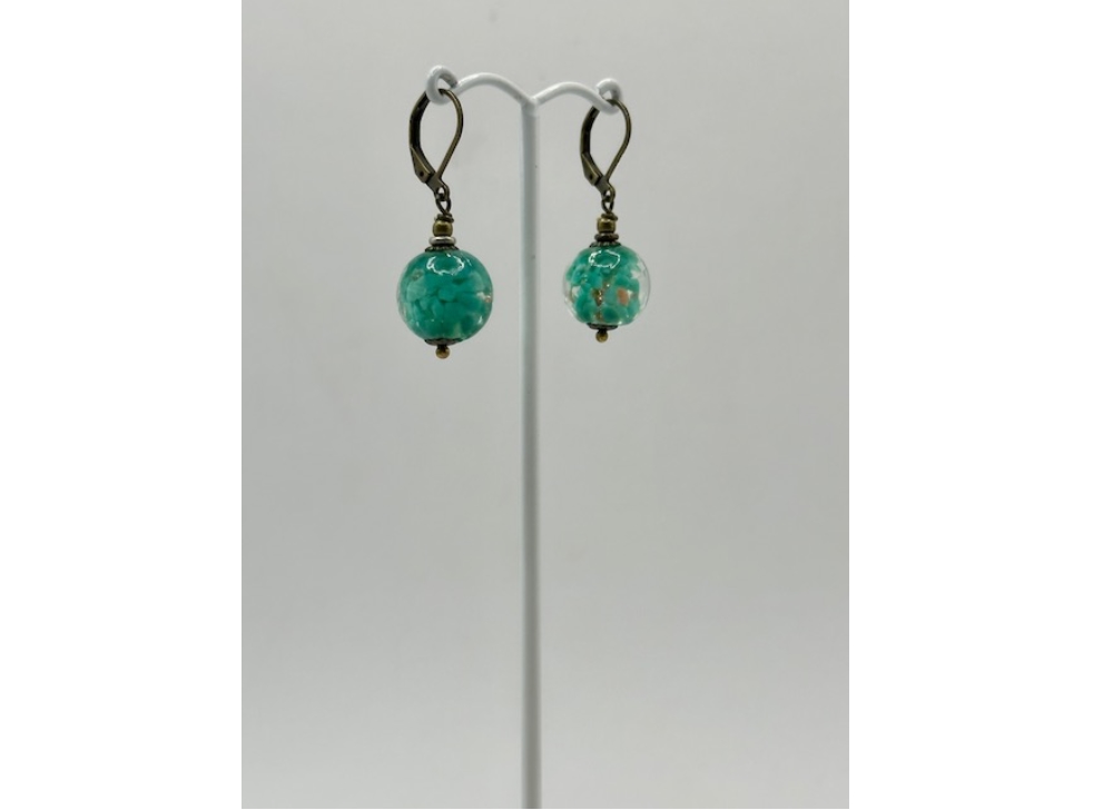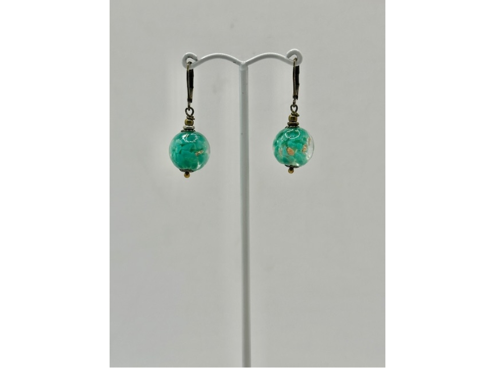 Wonderful aqua green glass with copper sparkles. Hand made lamp worked glass beads are 35mm from the top of the lever backed secure ear hook. The bead is approximately 14mm in diameter. A lovely depth into the glass bead. Such a cooling colour!