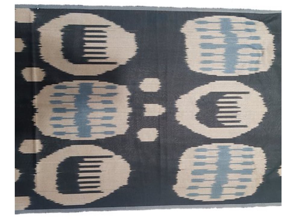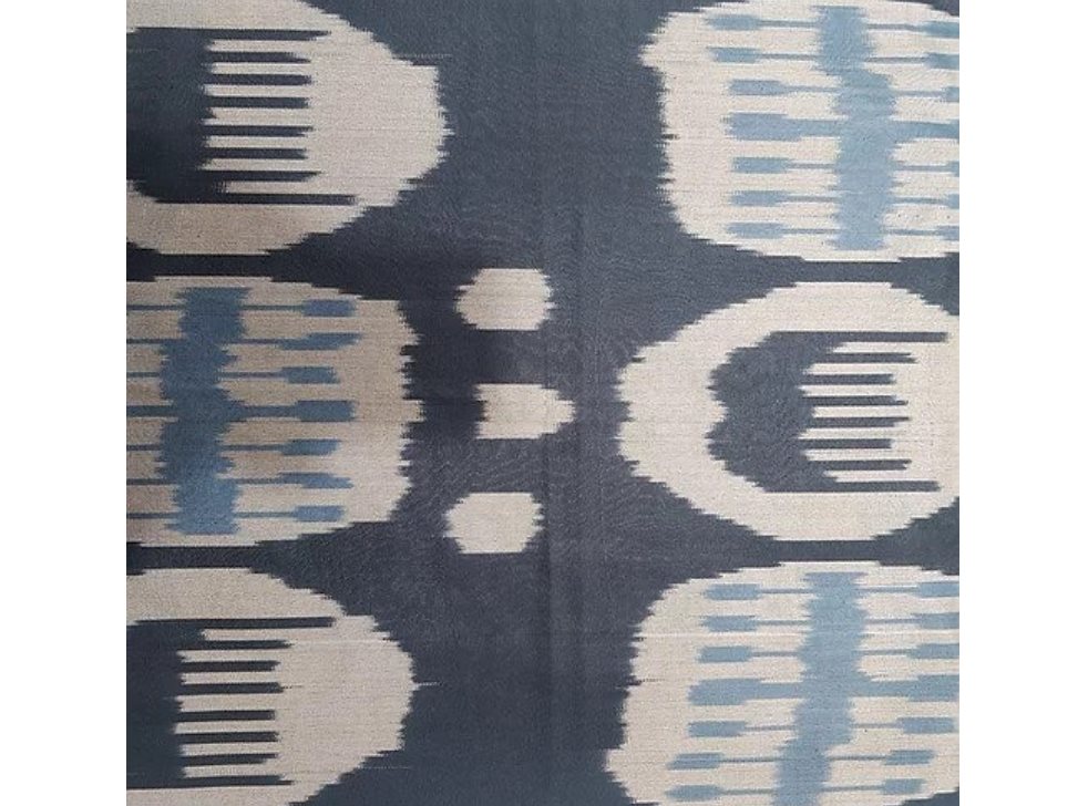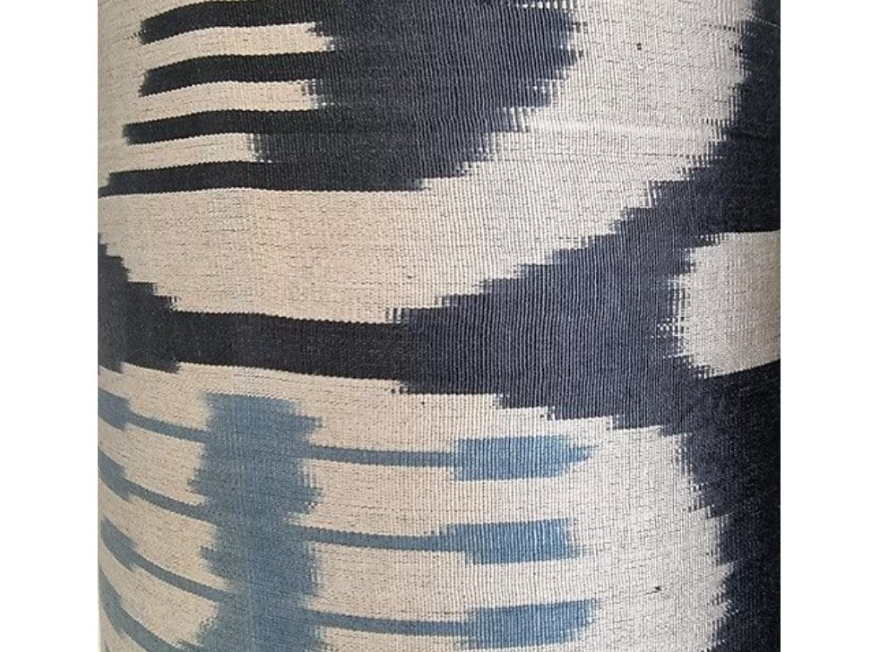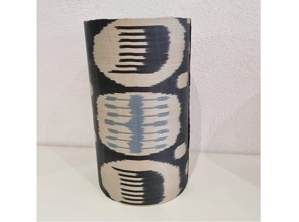 This lampshade is handmade from hand-loomed silk ikat fabric from Uzbekistan. A silver and sky blue design with a charcoal ground fabric with sky blue and white design. This fabric is handwoven on narrow looms so the maximum height for lampshades made from this material is 35cm. Our lampshades are made from handmade fabrics from around the globe. Each shade is unique and the fabric is made in limited quantity. Stands also available for purchase. Contact us at Fabric of Life.
