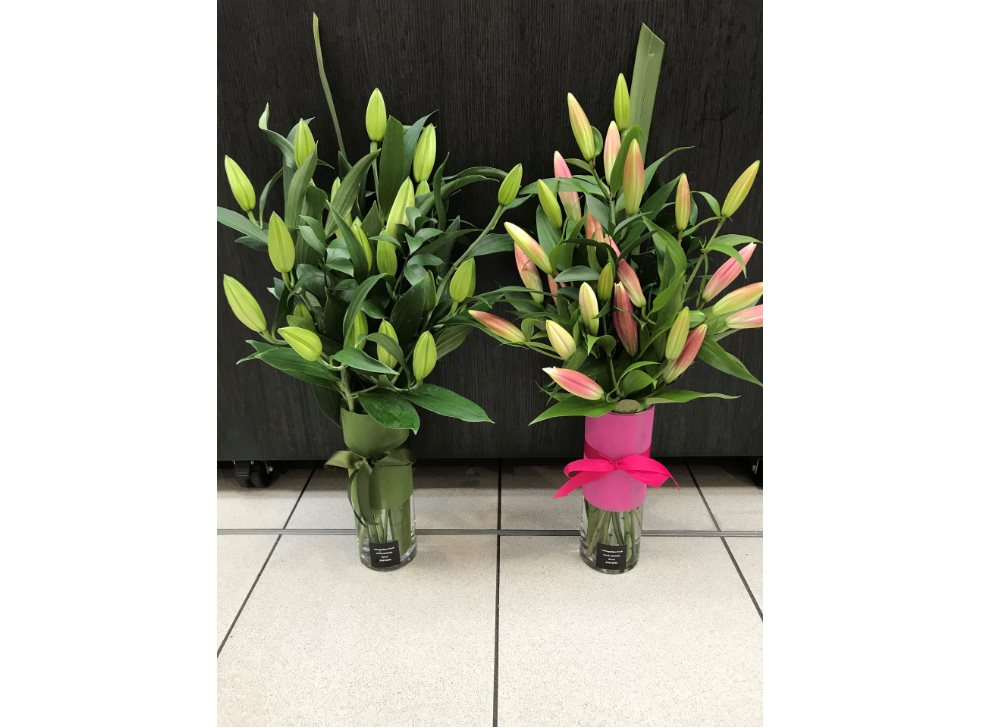 Fragrant Oriental Lily arrangement includes lush seasonal foliage, presented in a tall glass cylinder vase with a premium ribbon finish.