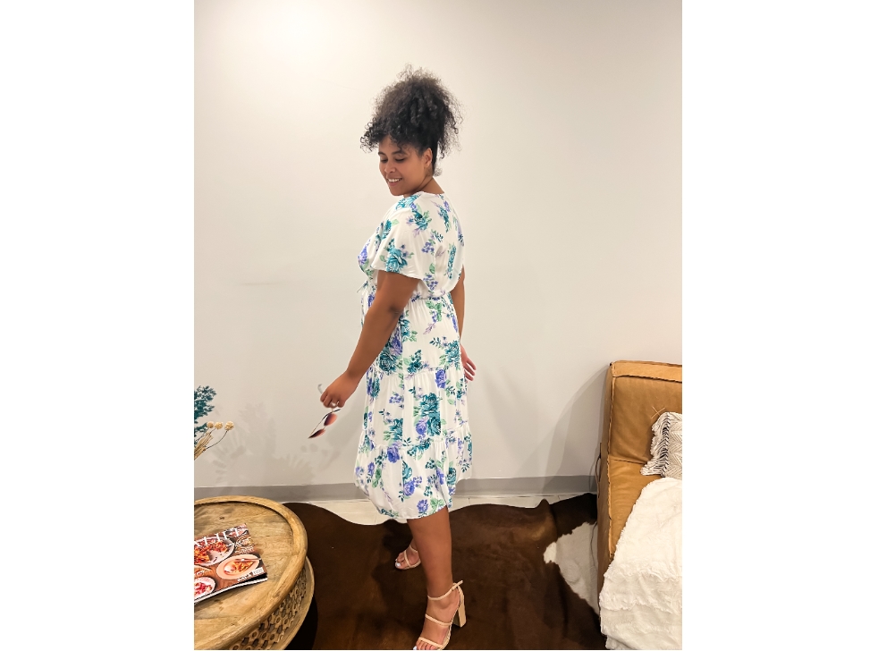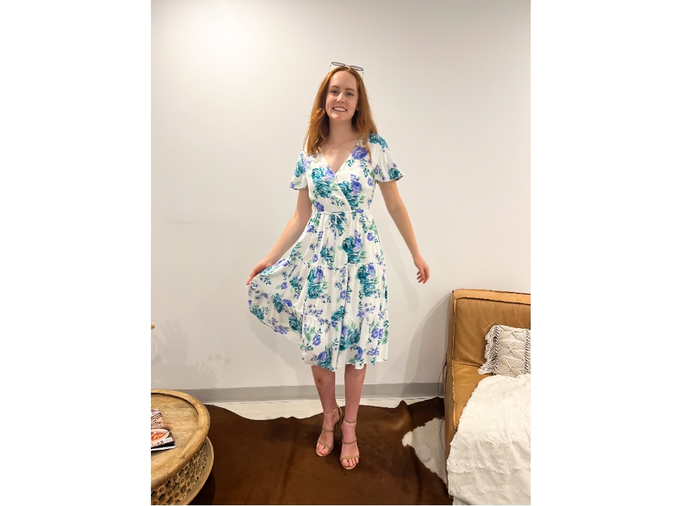 The Magnolia Dress is a beautiful white, lilac and emerald floral midi dress, featuring a cross over front, drawstring waist, tiered skirt and short flowy sleeve.