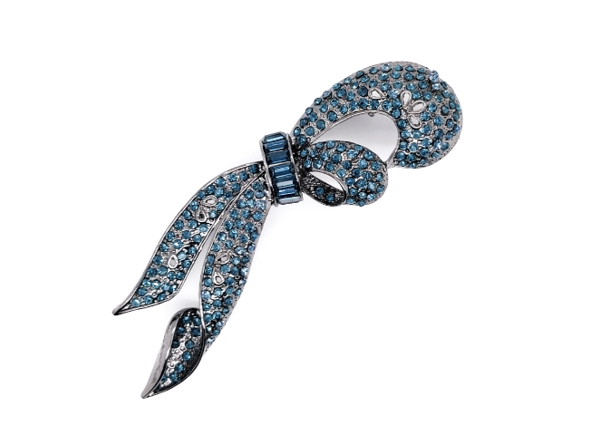 - Casting gun-metal colour ribbon brooch.- Montana blue Swarovski crystal- 70 mm (W) X 50 mm (H)- Made in South Korea.