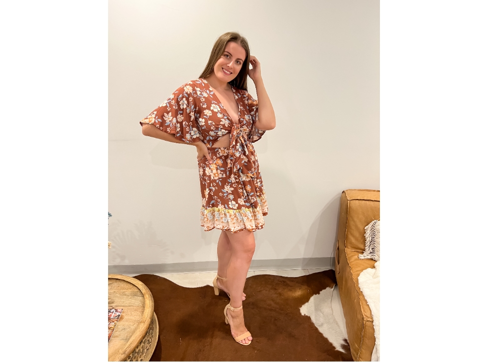 The Sylvia Dress is a chocolate floral mini dress, featuring a tied-knot bust, angel sleeves, elasticated waist and a cut-out waist. This style is slip on and fully lined.
