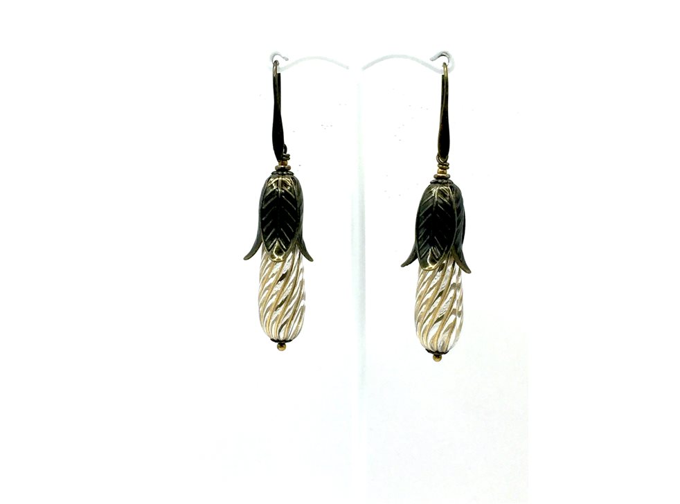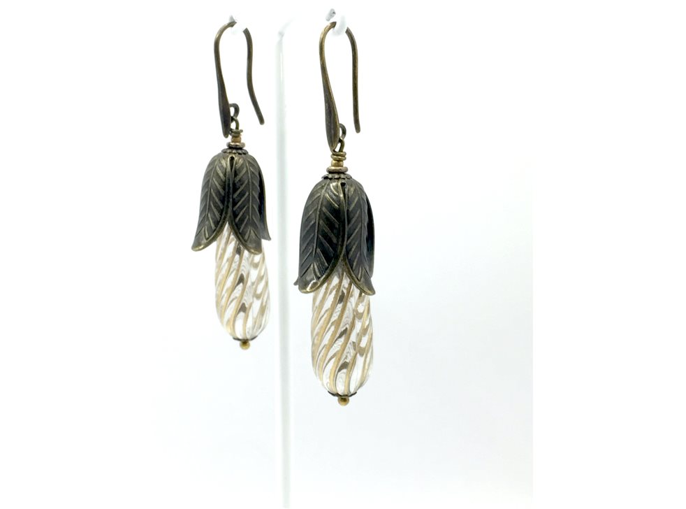 Delicate gold, spiral pattern on a vintage lucite clear bead, with a 1920's inspired, brass tulip bead cap. All using nickel free metal. They measure 6cm from the top of the hook to base of bead.